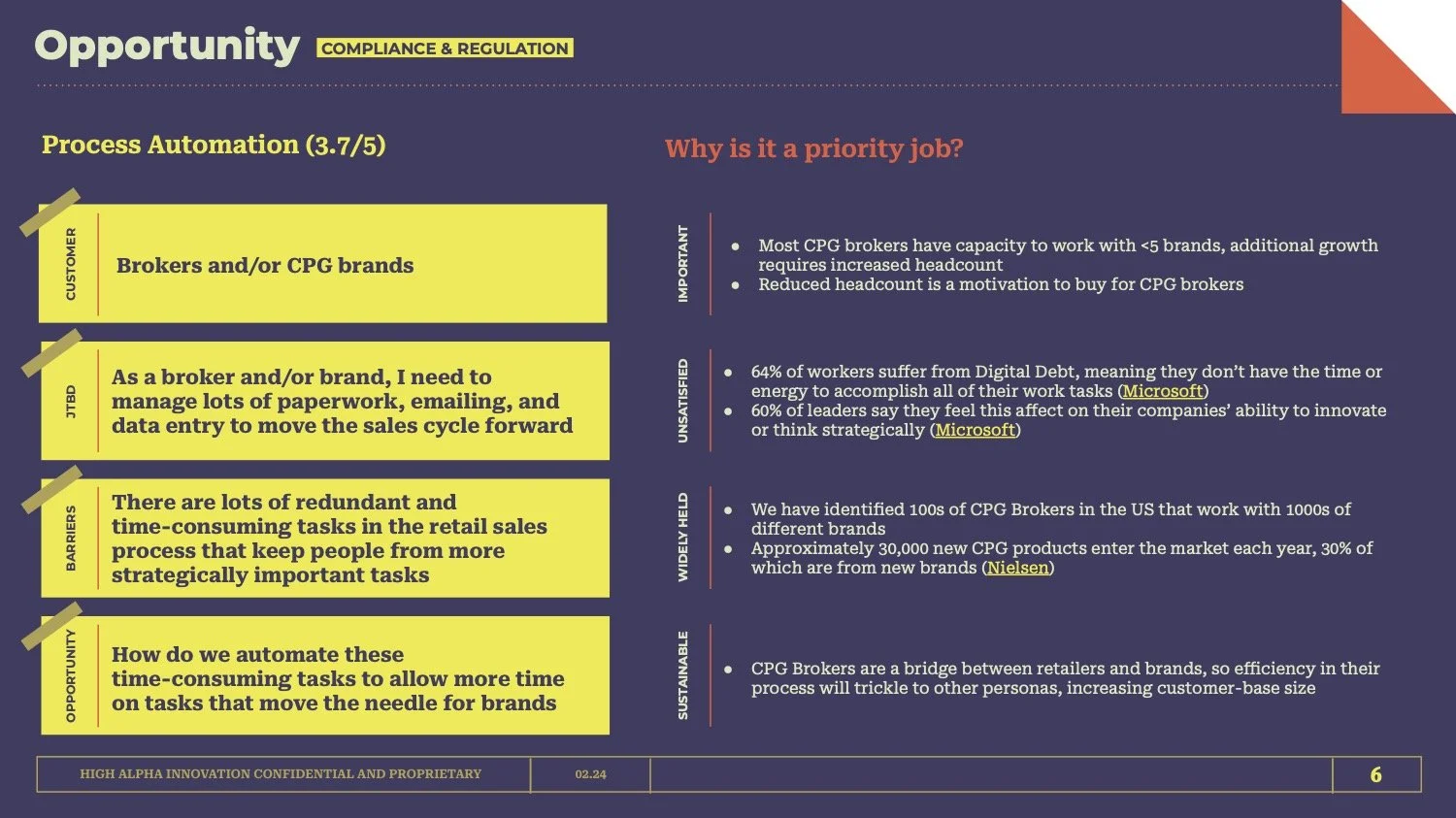 I conducted 8 weeks of top-down “assemble” research–starting at the highest level of “sector discovery”–to identify 27 opportunities for further analysis. These opportunities were uncovered through a mix of industry analysis and qualitative research with potential target personas and SMEs.