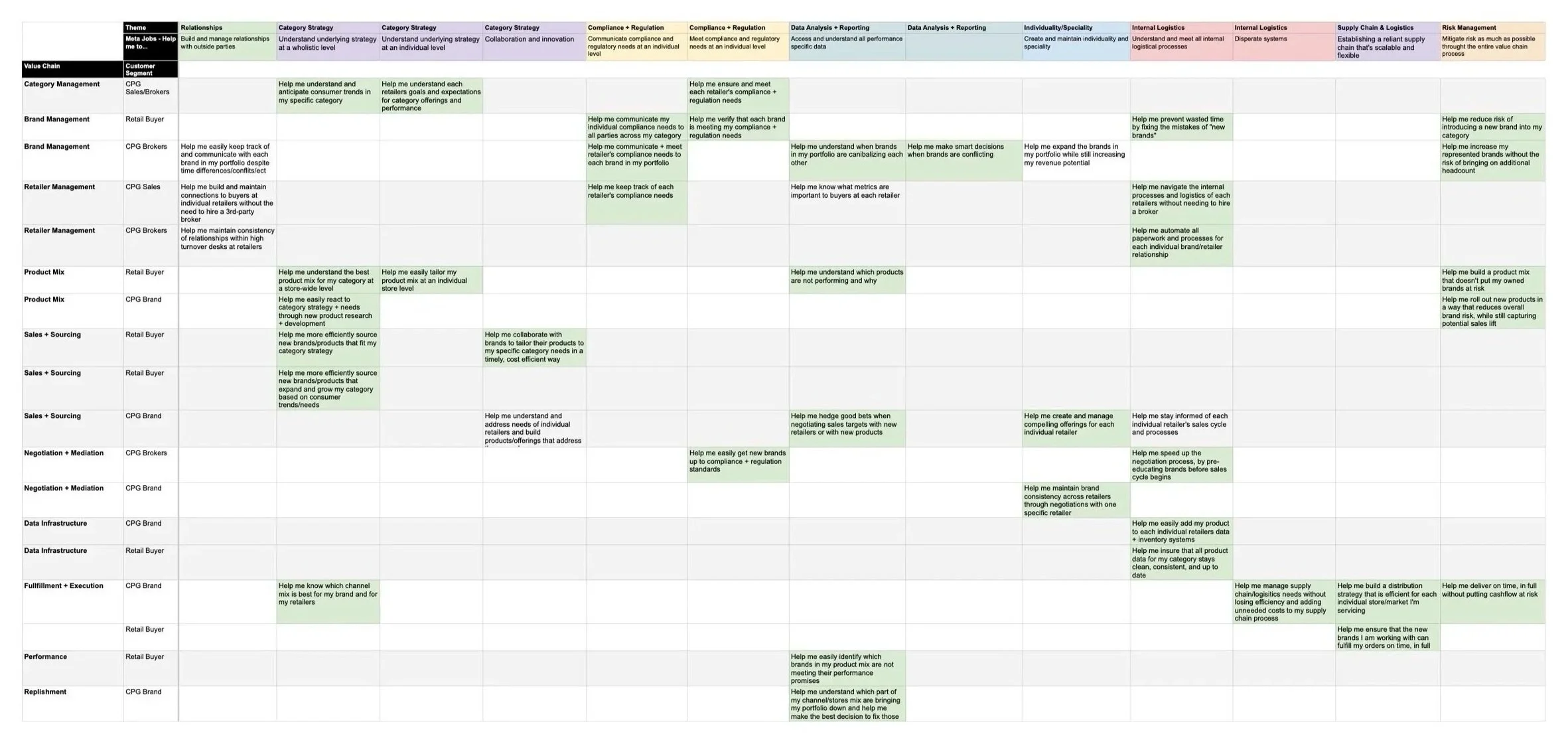 High level opportunity matrix of Value Chain x Problem Themes, further stepped down into customer segment and meta jobs.